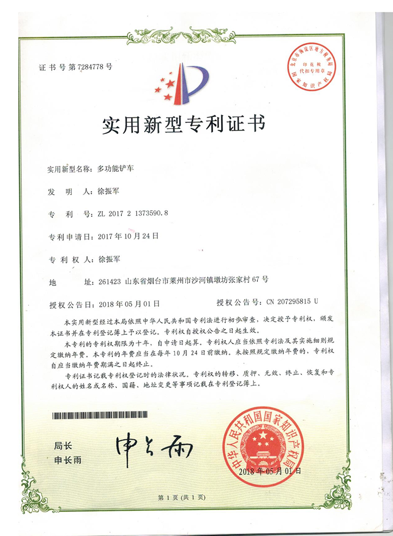• 獲得“多功能鏟車抓掉挖一體機”專利證書,開始生產兩頭忙,攪拌斗裝載機,同年更名萊州巨浪機械有限公司